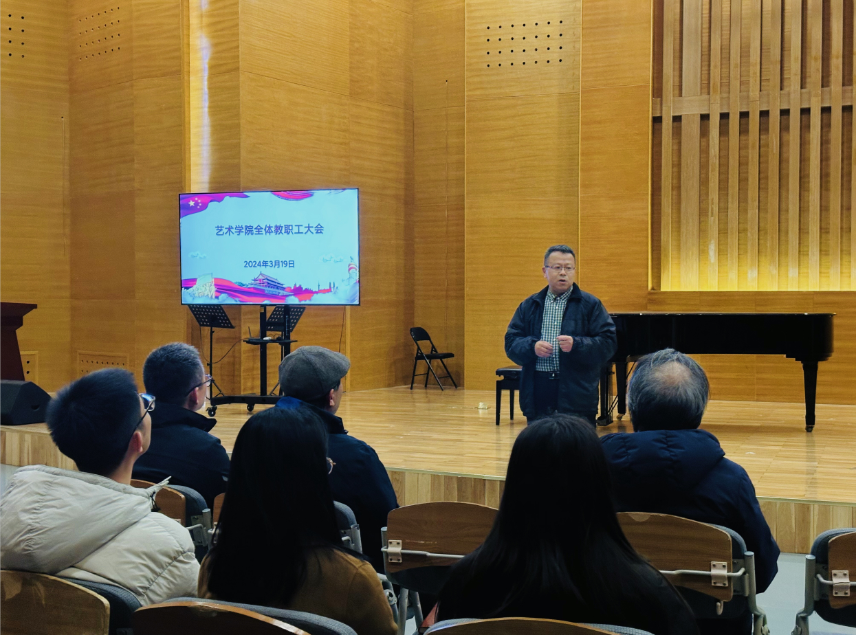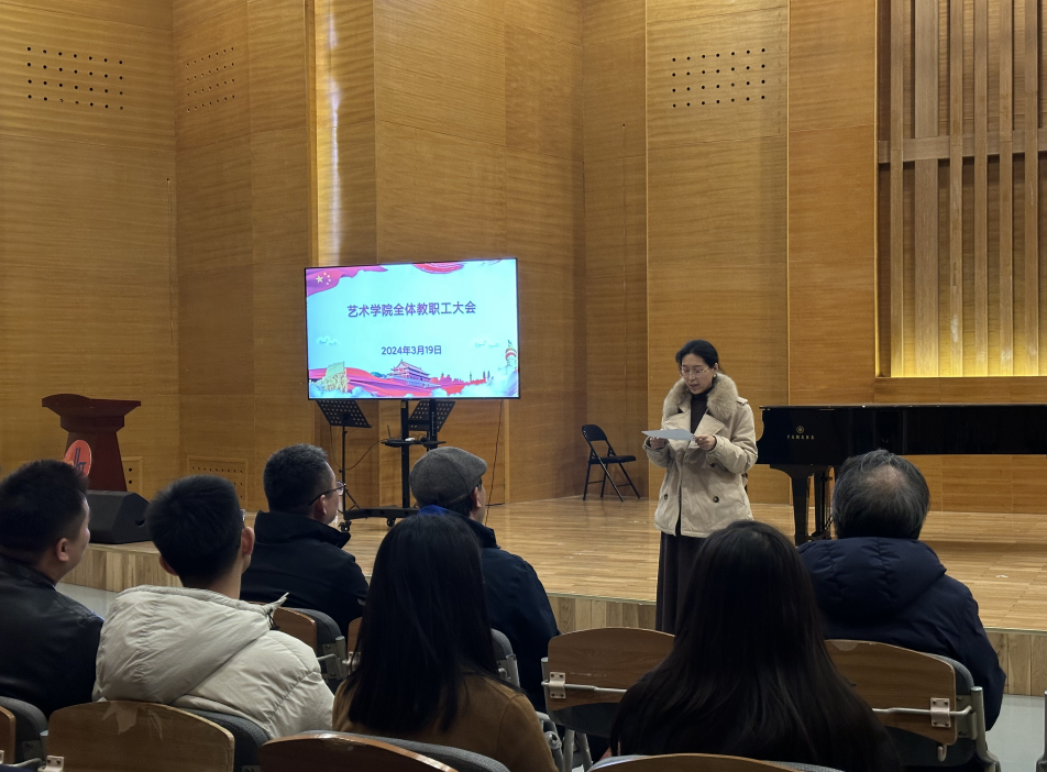 全院教职工大会在学校美育中心音乐厅召开,学校党委组织部副处级组织员齐青出席会议,学院党政领导和全体教职工参加会议。会议由学院党委书记刘庆主持。