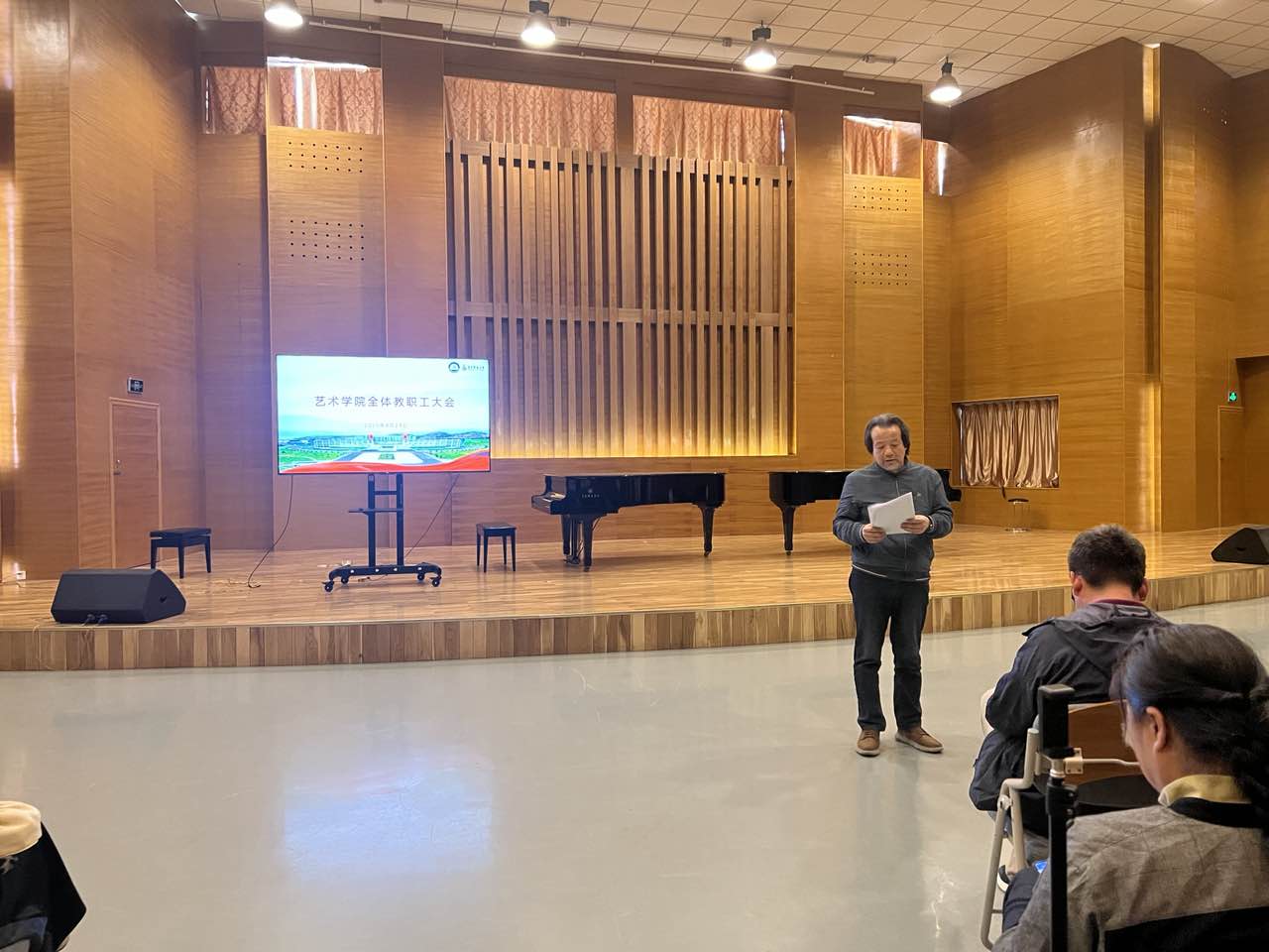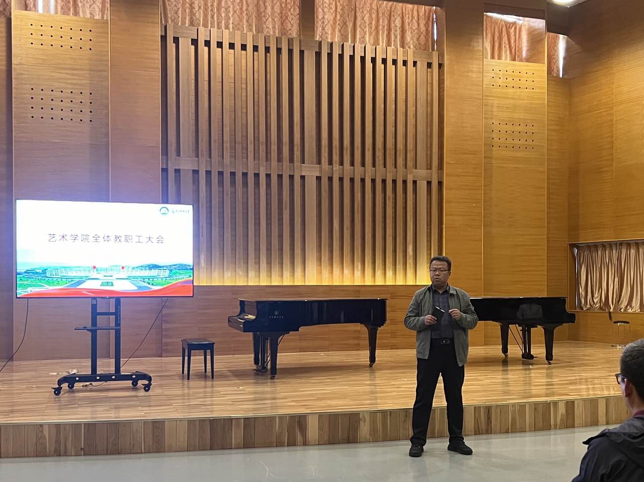 于音乐厅召开全院教职工大会,学校人事处副处长雷剑出席会议。会议由学院党委书记刘庆主持。