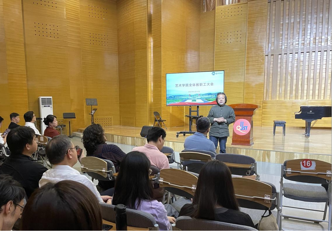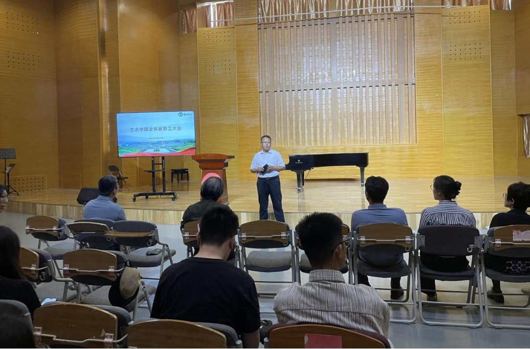 于音乐厅召开全院教职工大会,会议由学院党委书记刘庆主持。