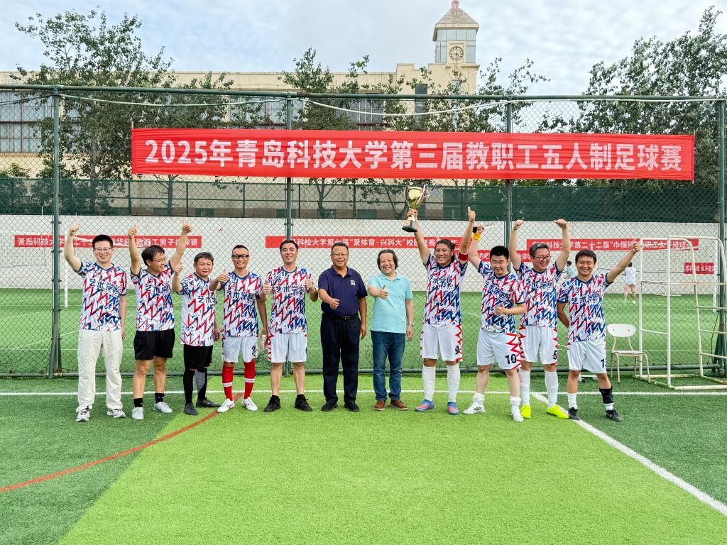 足球队以小组第一的成绩挺进半决赛,又以4:1的成绩战胜材料学院进入决赛。在决赛中,老师们在先失一球的不利局面下,克服高温天气,奋勇拼搏、积极跑动,场上场下一条心,相互鼓励支持,通过灵动的跑位、巧妙的传球、精准的射门,接连打进3球,最终以3:1的比分战胜高分子学院,获得比赛冠军。