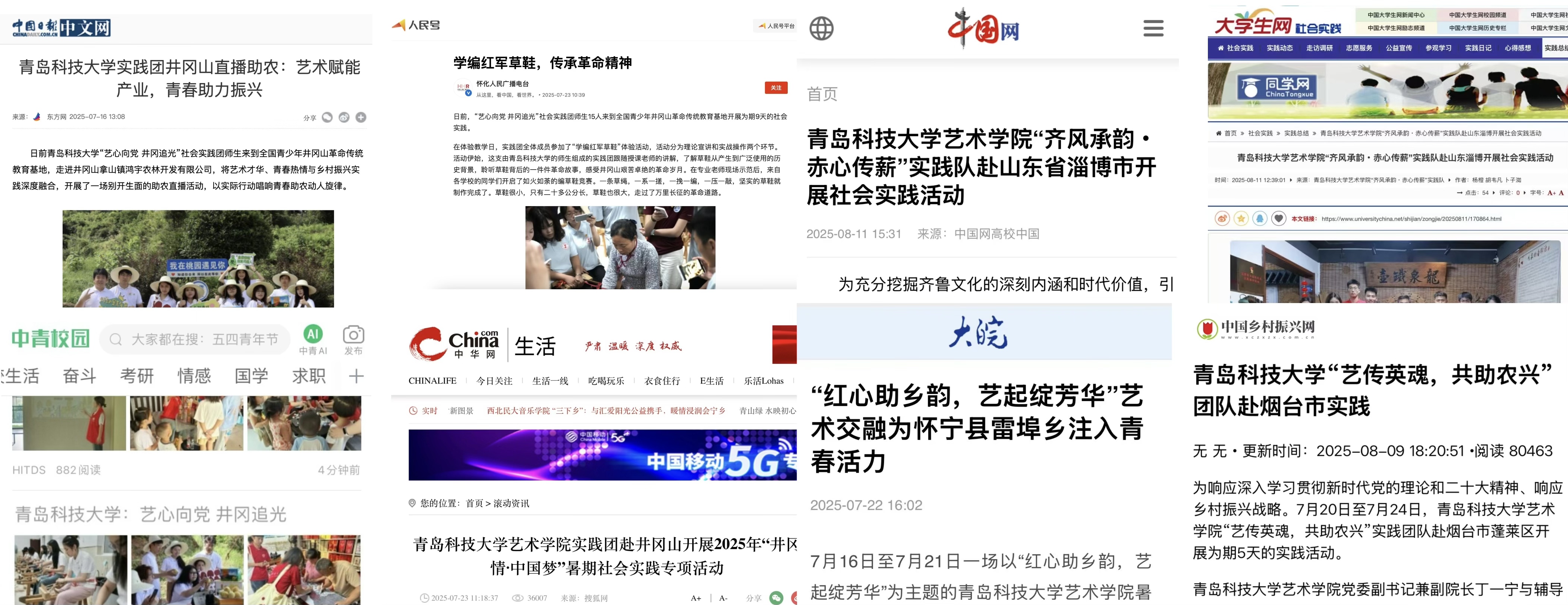 学院依托多渠道、多维度传播矩阵,在国家级、省级、校级网站与新媒体平台持续获得报道与关注。各实践团事迹得到中国日报、人民日报、中青校园、中华网、大众日报等多家权威媒体的报道,在学校官方微博、抖音发布多期短视频,校级、学院网站共发布实践纪实50余期。实践团成员创作的文创设计、研学手册、绘画作品、系列短视频作品以及详实的调研报告,为当地留下了宝贵的资源。艺院学子的一次次实践之旅,以文创激发产业潜能,用镜头传播乡土魅力,谱写了一曲曲青春与社会发展同频共振的动人乐章。