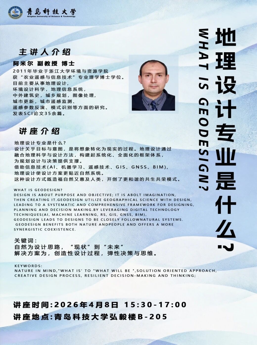 为拓展学术视野、促进跨学科交流,4月8日,环境设计系举办“环艺前沿”系列讲座,特邀阿米尔副教授作题为“地理设计专业是什么?”的学术报告,师生积极参与并展开交流。