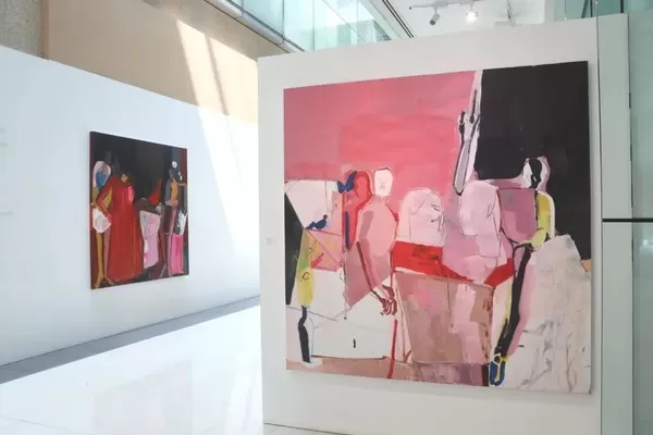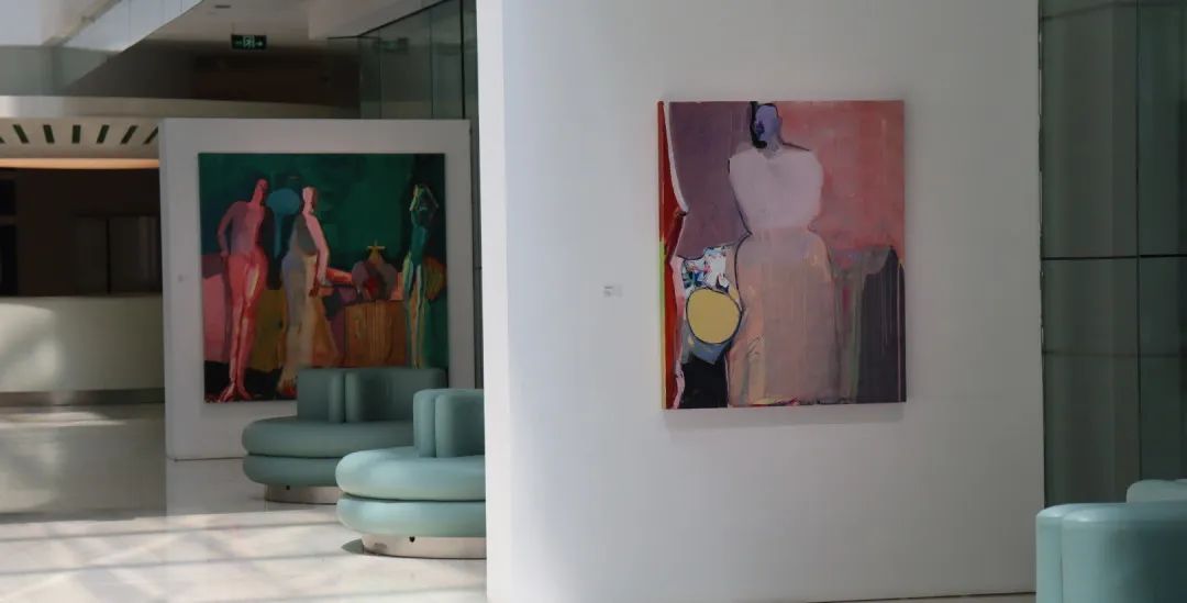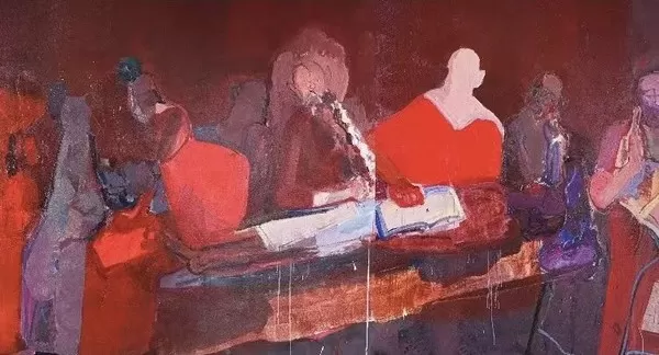 此次展览中,崔建军的代表作《理想国》和《哲学家的相遇》成为亮点。这些作品通过对具象形态的抽离与形体的扁平化处理,展现了艺术家对古典绘画语言的深度解构与现代艺术的重组。尽管作品中的形象依然具象,但崔建军通过自由挥洒的手绘印迹,打破了现实物象的束缚,创造出一种既抽象又具象的艺术语言。这种语言在色彩、光影、线条的处理上展现了极强的表现力,色彩的覆盖与延展充满张力,锋利的线条精准而有序,形成了既具秩序又富有内在冲突的视觉效果。