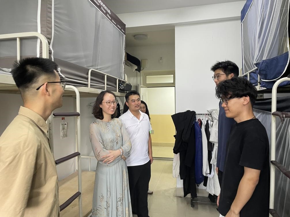 会后,丁一宁带领学工队伍走进学生宿舍,与宿舍楼长深入沟通,了解暑期宿舍升级改造情况。老师们和已返校的老生亲切交流,询问假期生活与返校适应情况;同时查看新生宿舍,排查安全隐患,确保新生入学后能拥有舒适、安全的居住环境。