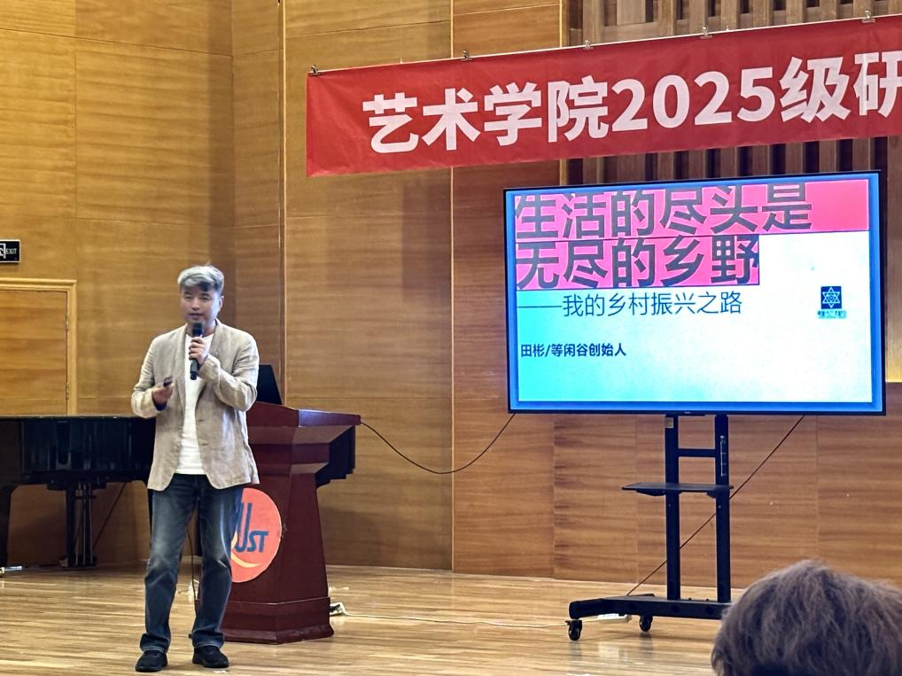优秀校友代表田彬与研究生们亲切交流,回忆学生时代的美好生活,言语之间尽显对母校的深情与热爱,用自己的切身经历向同学们传授创业经验。从创业初的艰辛到后期调整目标定位,田彬紧密跟随国家乡村振兴战略,创立了“等闲谷艺术粮仓”,将生态文明与文化艺术相结合,走出了一条文旅产业与乡村振兴融合发展的特色道路。他的事迹为研究生们提供了很好的榜样,让大家对艺术之路有了开拓性的认识。