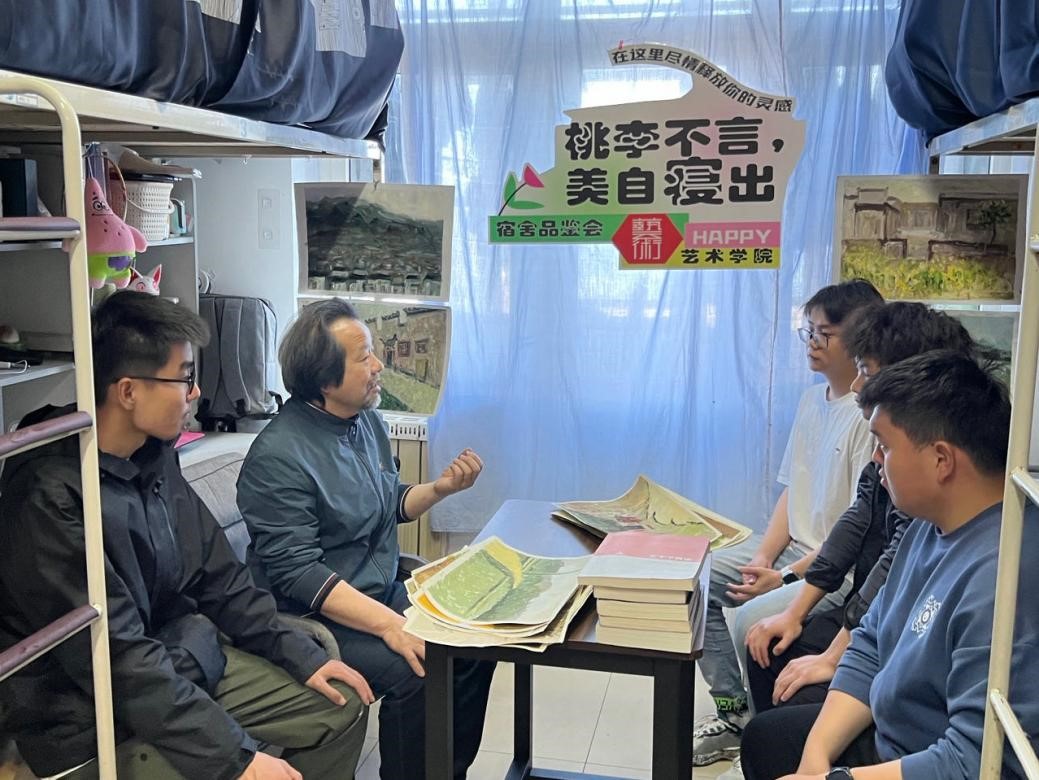 学院党政领导走进学生宿舍,与同学们亲切交流,共同品鉴学生作品。李宏文首先对同学们的专业能力与付出表示肯定,接着他结合自身创作经历向同学们分享创作经验并对同学们的作品以一一品评,鼓励同学们要找准自身优势,抓住一个点努力深耕,不断探索艺术创作的魅力。同学们积极展示并围绕自己的作品向大家阐释创作灵感、创作过程以及心得体会并向院长虚心请教如何精进。