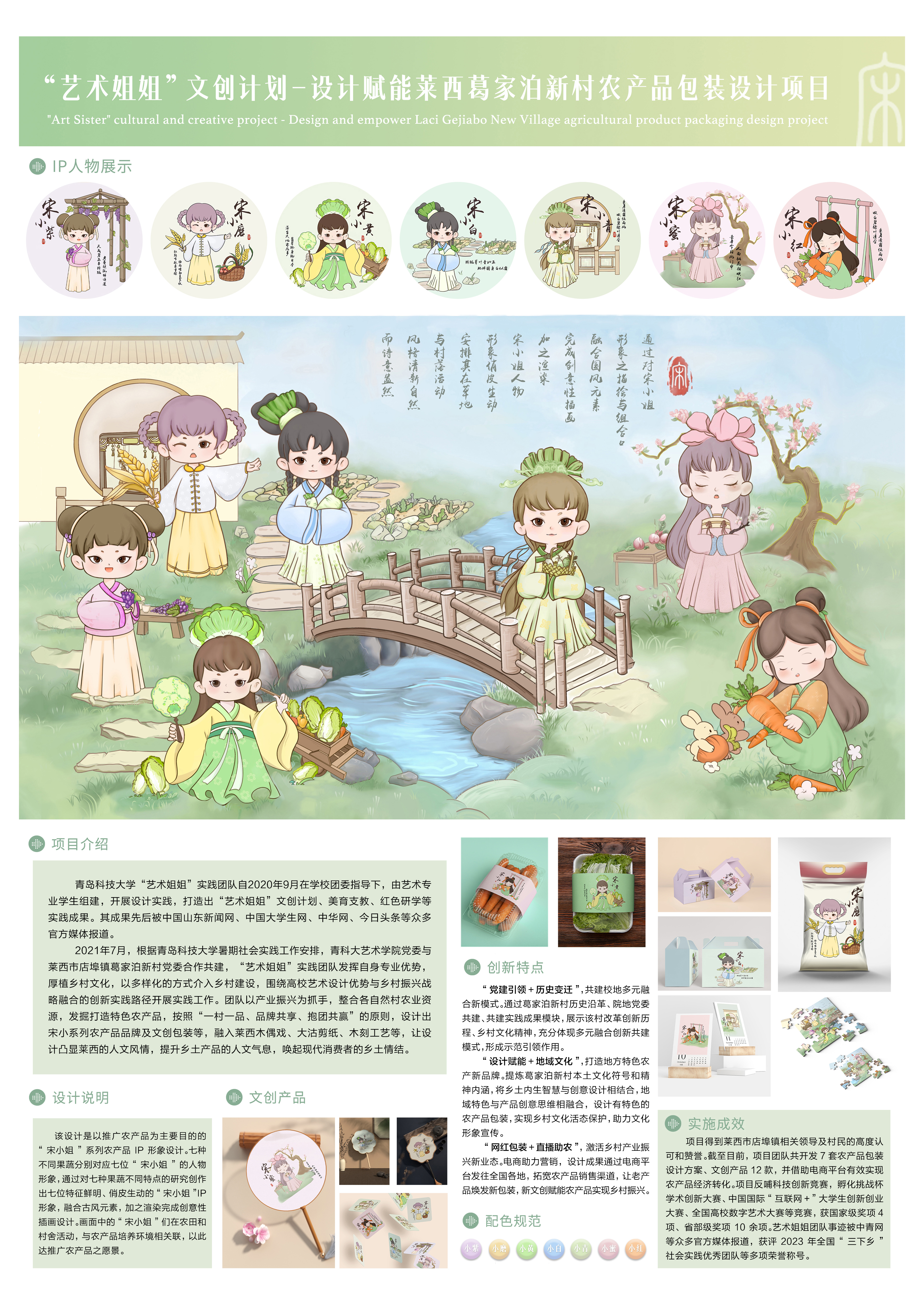 “艺术姐姐”实践团队自2020年9月成立以来,相继打造出“艺术姐姐”文创计划、美育支教、红色研学等社会实践成果。学院党委与莱西市店埠镇葛家泊新村党委合作共建后,实践团队发挥自身专业优势,厚植乡村文化,以多样化的方式介入乡村建设,围绕高校艺术设计优势与乡村振兴战略融合的创新实践路径开展实践工作。团队以产业振兴为抓手,整合各自然村农业资源,发掘打造特色农产品,设计农产品品牌及文创包装。“‘艺术姐姐’文创设计——设计赋能莱西葛家泊新村农产品包装设计项目”是学校“艺术姐姐”社会实践队在乡村实践过程中主动服务乡村振兴战略所需、立足莱西葛家泊新村实际催生的社会实践成果。