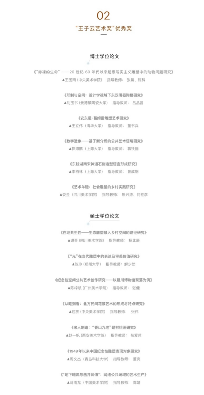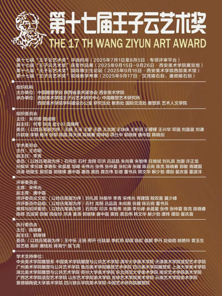 “王子云艺术奖”是2009年由中国雕塑学会、陕西省美术家协会、西安美术学院发起设立的全国性艺术奖项,以中国现代美术教育先驱、艺术考古开拓者王子云先生之名命名,它不仅奖励雕塑艺术创作,还奖励美术学雕塑艺术方向的优秀硕、博学位论文,是雕塑创作和雕塑史论研究的双项并举,具有实践与理论并重的学术导向。该奖项素以学术严谨性著称,尤其注重艺术创作的创新性、思想性以及对传统文化与当代语境的融合贯通。